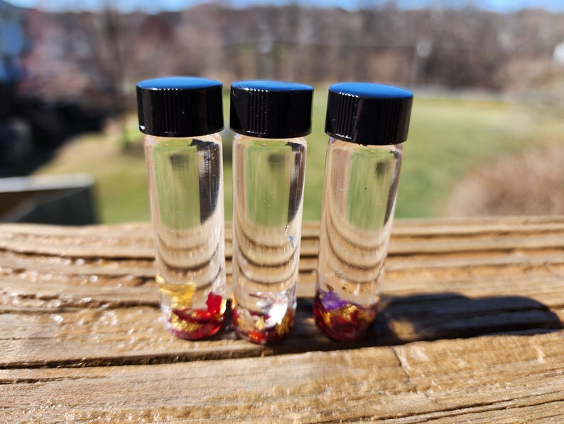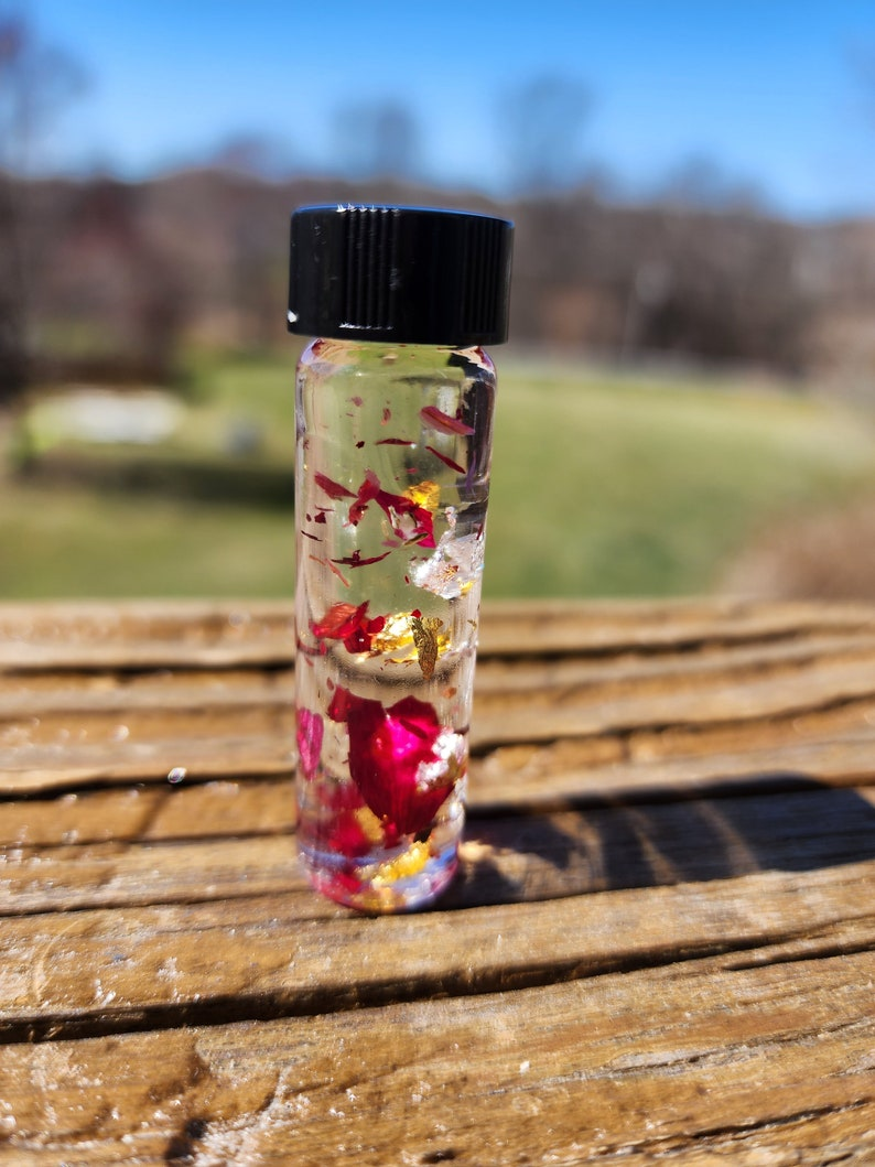 The gold and silver flakes inside the bottles are real, and all tiny gem chips in the bottles are also stones that are safe to leave in water and oils. There are also small bits of herbs and flower petals in most bottles. The bottle itself is approximately 2 drams (about 7.4 ml). You’ll likely only need a few drops of oil at a time for workings (and this is a very thin oil that spreads easily), so a little goes a long way.