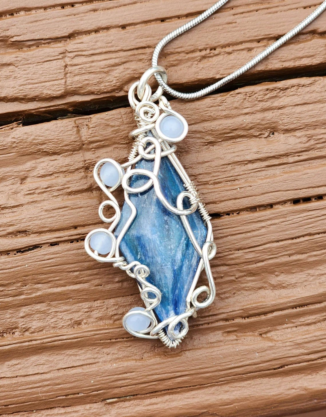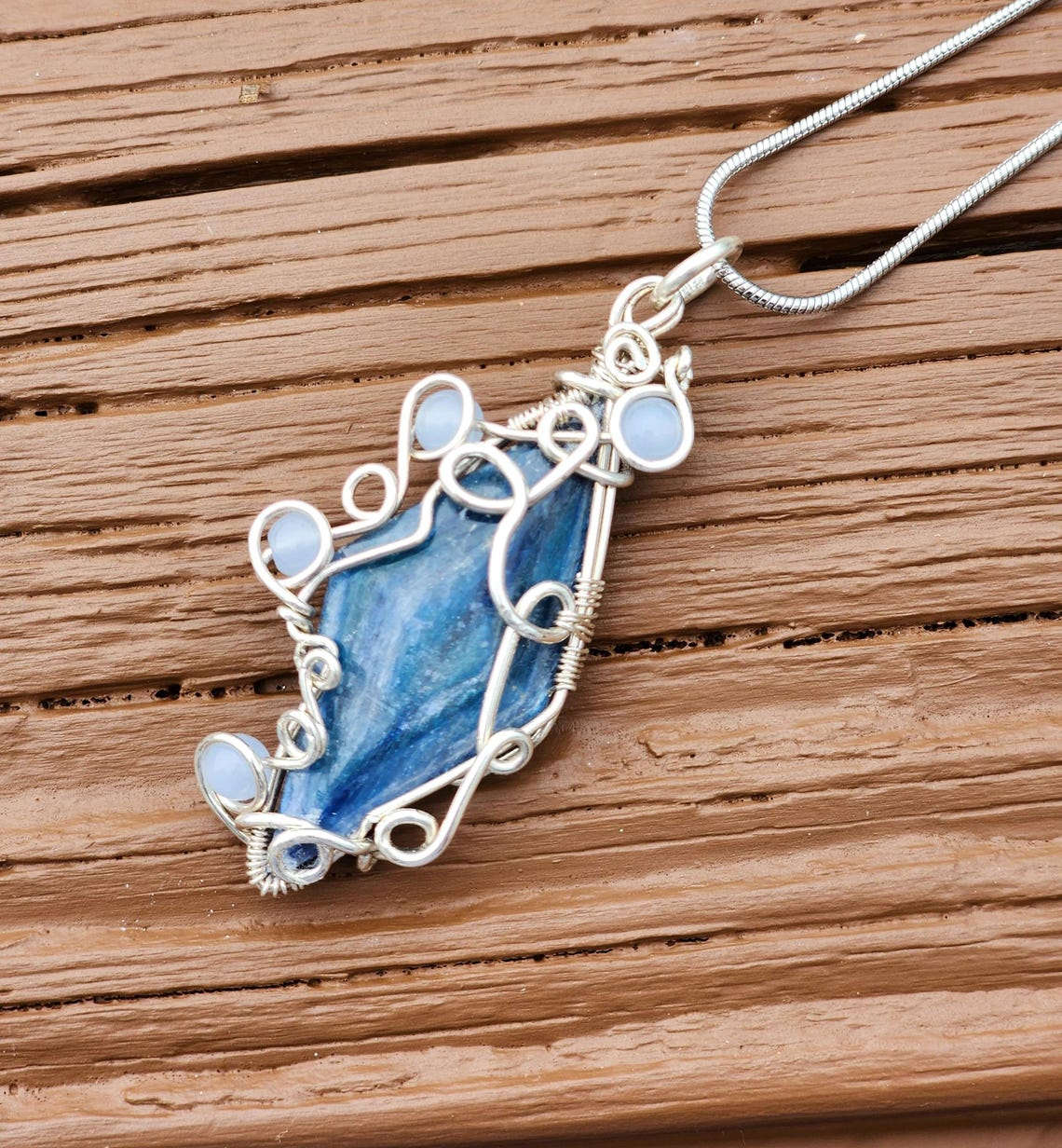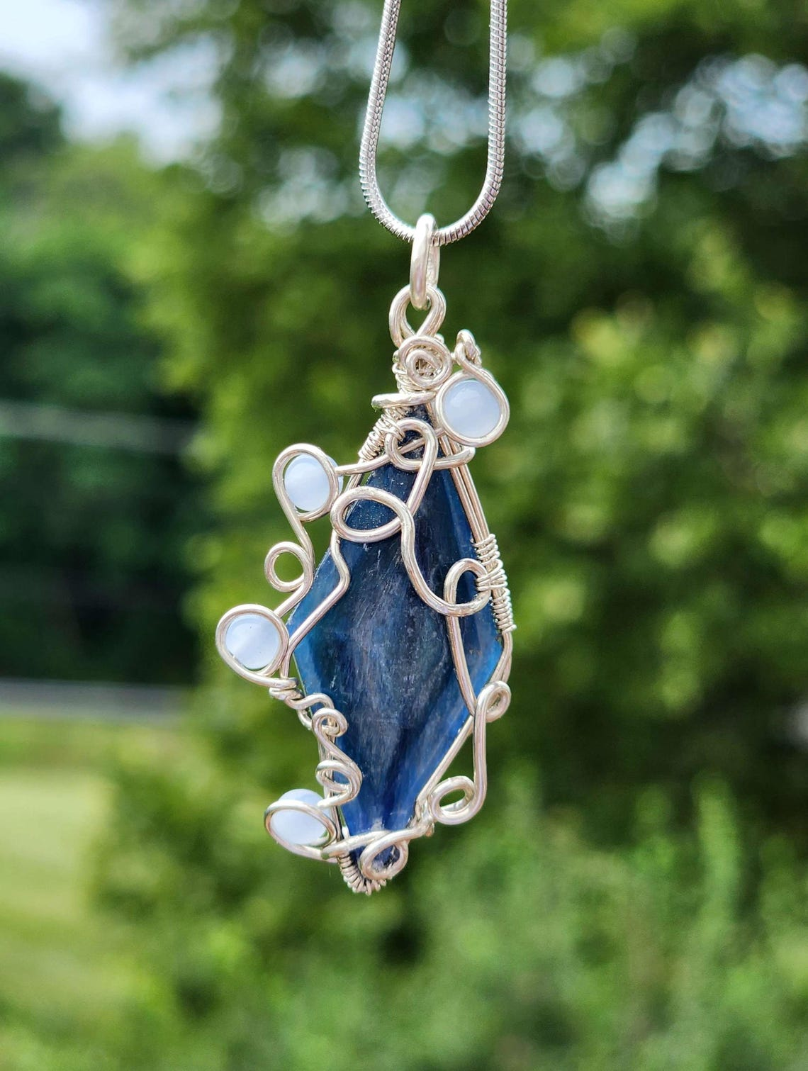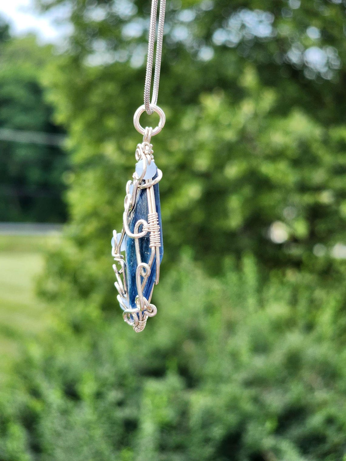 This is a pendant made with kyanite, aquamarine, and solid sterling silver.
